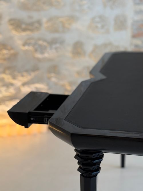 Le dessin du plateau et du piètement, aux lignes sculpturales, contraste avec la sobriété du cuir gainé. Présent dans les chambres et suites de l’Hôtel de Pavie à Saint-Émilion, son nom évoque une teinte profonde et chaleureuse, entre rouge sombre et noir aubergine. Le bureau conjugue finesse d’exécution, équilibre des proportions et noblesse des matériaux. Équipé d’un tiroir invisible et de prises discrètes, il revisite les codes classiques dans une écriture fonctionnelle, précise et sensuelle. Une pièce sculpturale inspirée des meubles d’apparat, pensée pour durer.