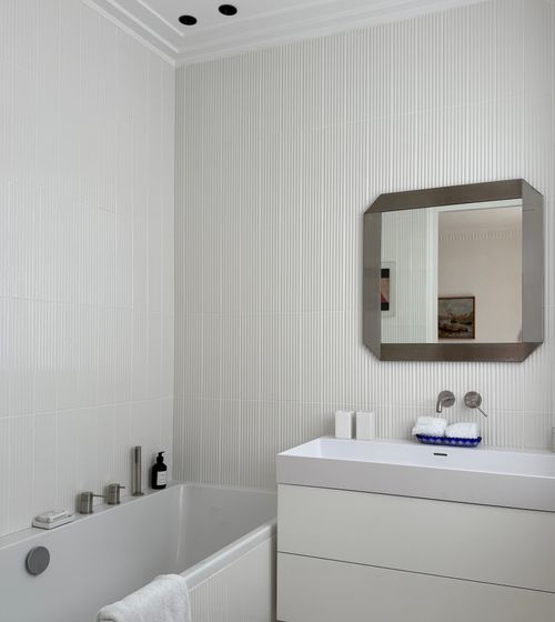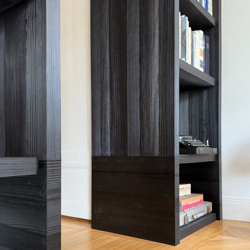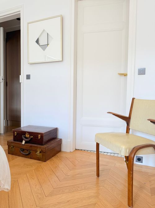 Le projet articule une série de gestes précis : dessin sur-mesure de toutes les menuiseries, redéfinition des espaces, composition rythmée des pleins et des vides, travail de la matière en continuité visuelle et sensorielle. Dans la cuisine, les façades en placage de frêne naturel s’accordent à un travertin aux veinages feutrés, qui court en crédence et plan de travail, jusqu’au sol en chevrons revisité. Dans les dressings, un travail de menuiserie en chêne teinté ponctue le linéaire des rangements, jouant sur l’ombre et la lumière.