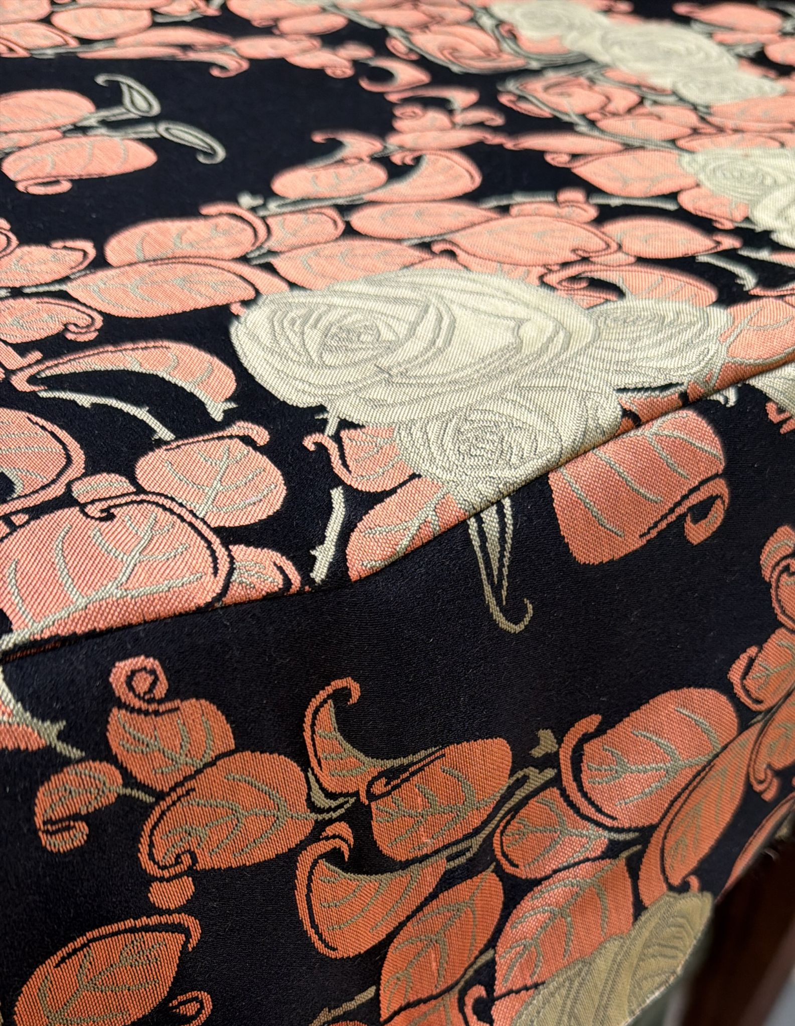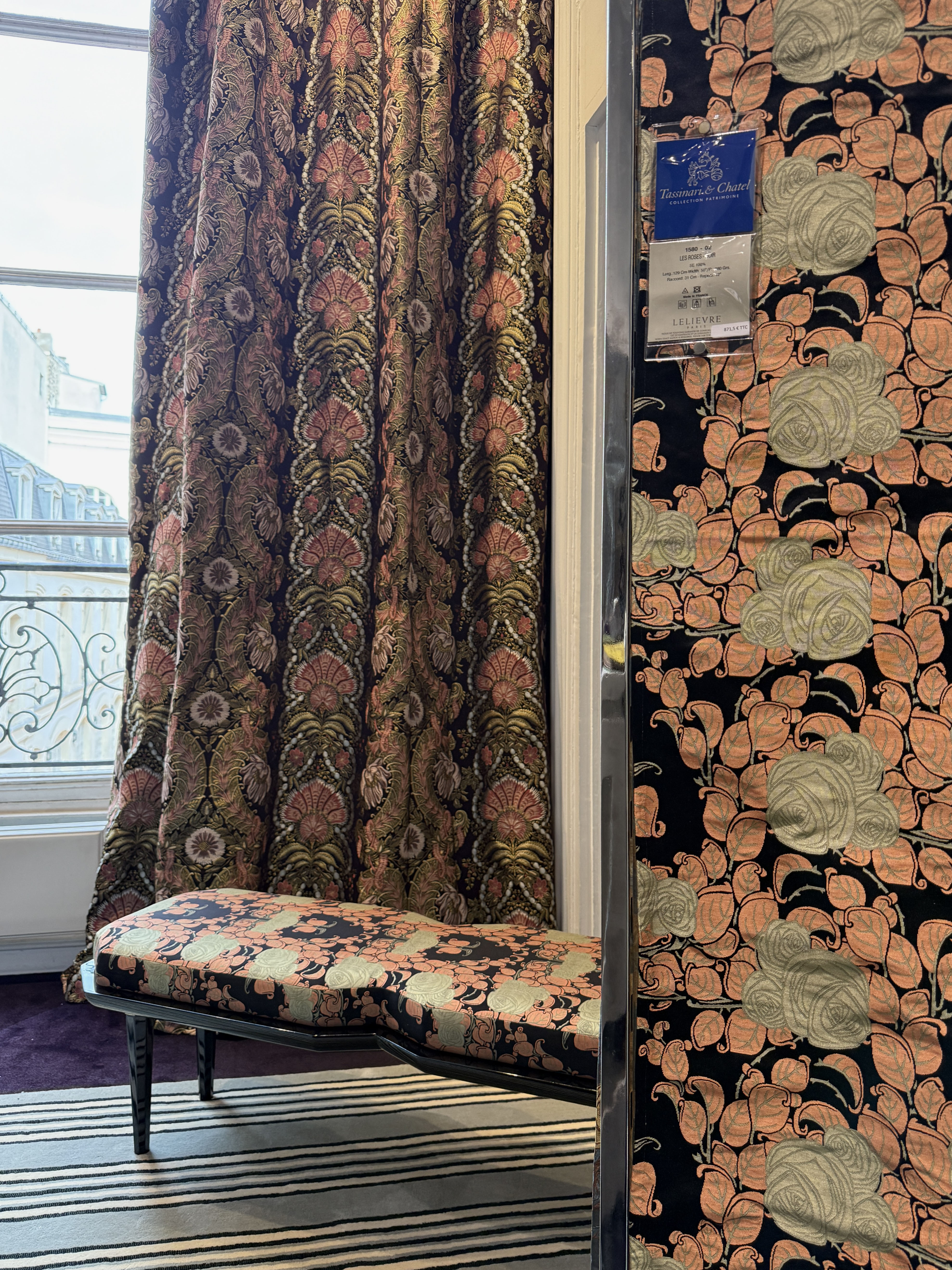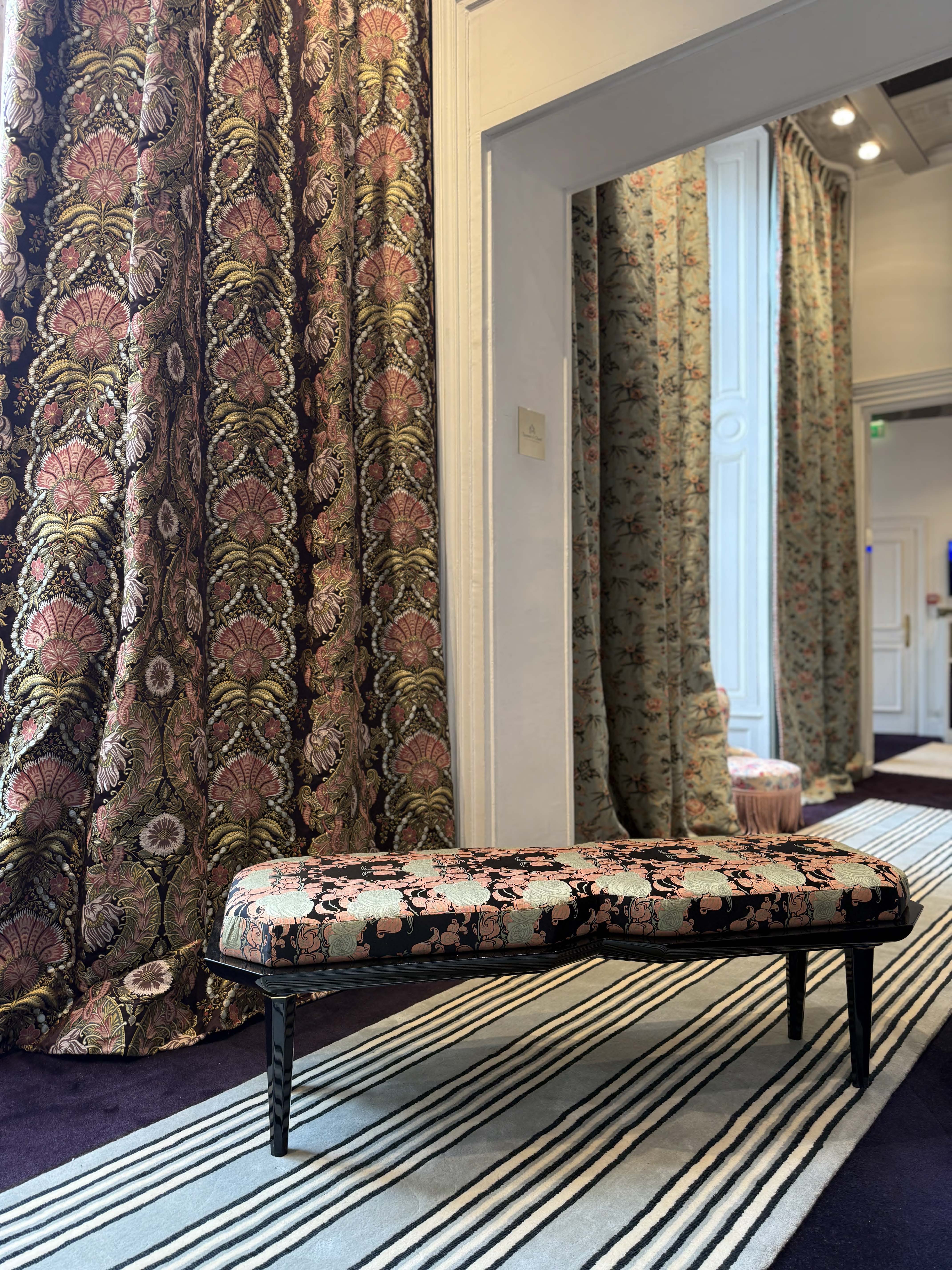 Conçu en 1911 par les ateliers Tassinari & Chatel d’après un dessin de Paul Follot, ce lampas à trois lats déploie un motif floral raffiné, où chaque rose stylisée dialogue avec la géométrie du tissage. Ce même dessin, commandé en 1924 sur fond noir par la Compagnie Générale Transatlantique, a été utilisé pour les salons Grand Luxe du paquebot Paris, témoignant de la modernité et de la prestige des créations lyonnaises.